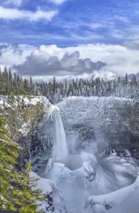 This opening Gallery for 2018 contains a collage of eight images taken over two days at Helmcken Falls in Wells Gray Provincial Park in British Columbia. To compensate for extreme light variance in the compositions, each image was bracketed plus and minus one and two stops. Generally the best three were merged using High Dynamic Range software (PhotomatixPro). The posted images attempt to give viewers different perspectives of the photographic potential of the falls in winter. This is a spectacular location about an hour from Clearwater. Although the snow pack was heavy and we used our 4X4, the road was in good condition, graded and sanded almost all the way. It's a must site in late February and one we highly recommend if the weather cooperates. The key is to time your visit after the mist and snow have formed a sizable "cone." As the sun is fairly low on the horizon at this time of year and the viewpoints face east, the venue is best photographed between 11:00 AM to 1:30 PM when the side light creates shadows, hopefully in a partially cloudy sky. There is no strenuous hike involved as the viewpoints are less than a minute from roadside parking and the park staff had cleared a path through the snow. Dress warmly as you'll be in the middle of nowhere with the potential for deep freeze conditions and intermittent weather patterns, usually accompanied by a stiff breeze. As the location is less than three hours from our home, we watched for a partly cloudy day before visiting.
